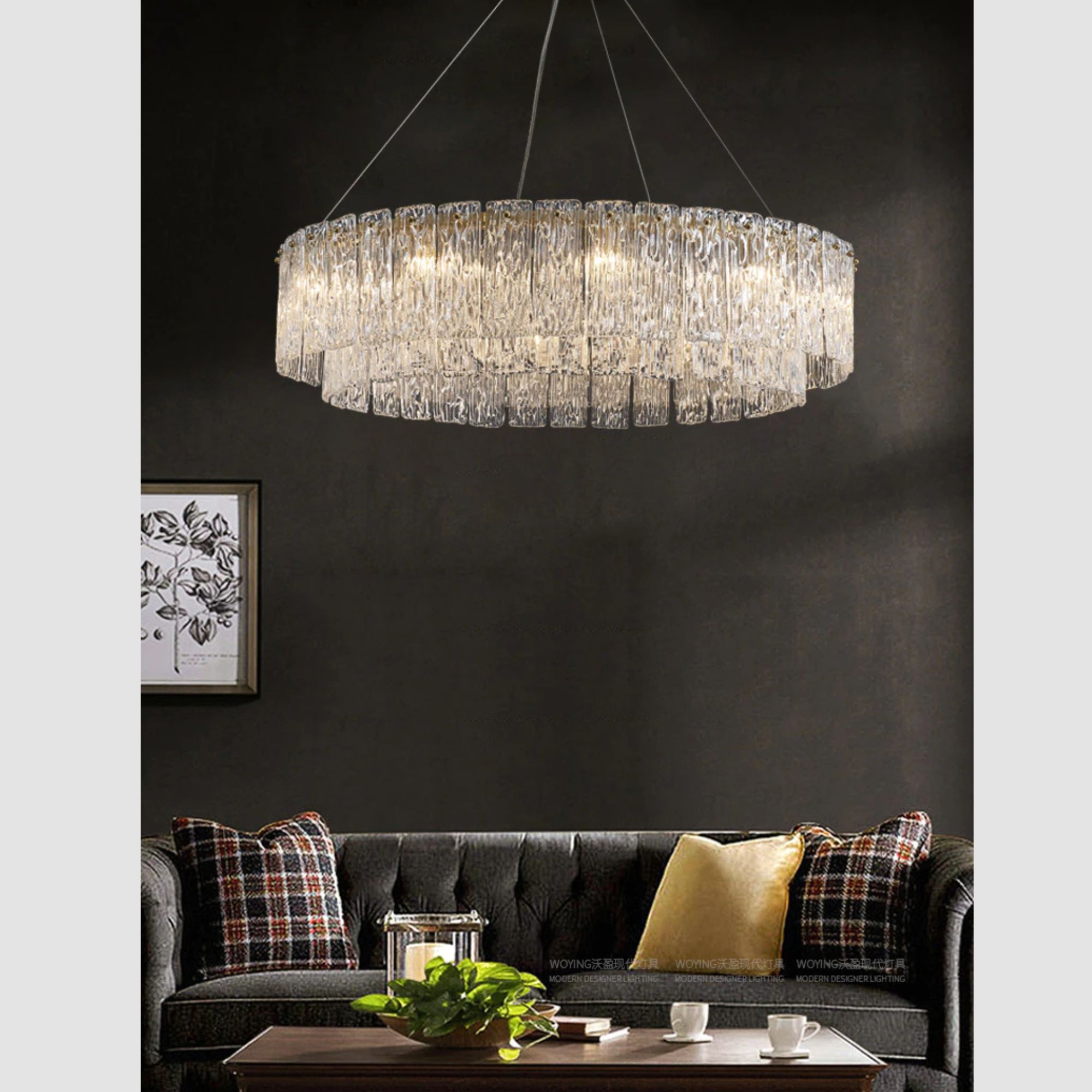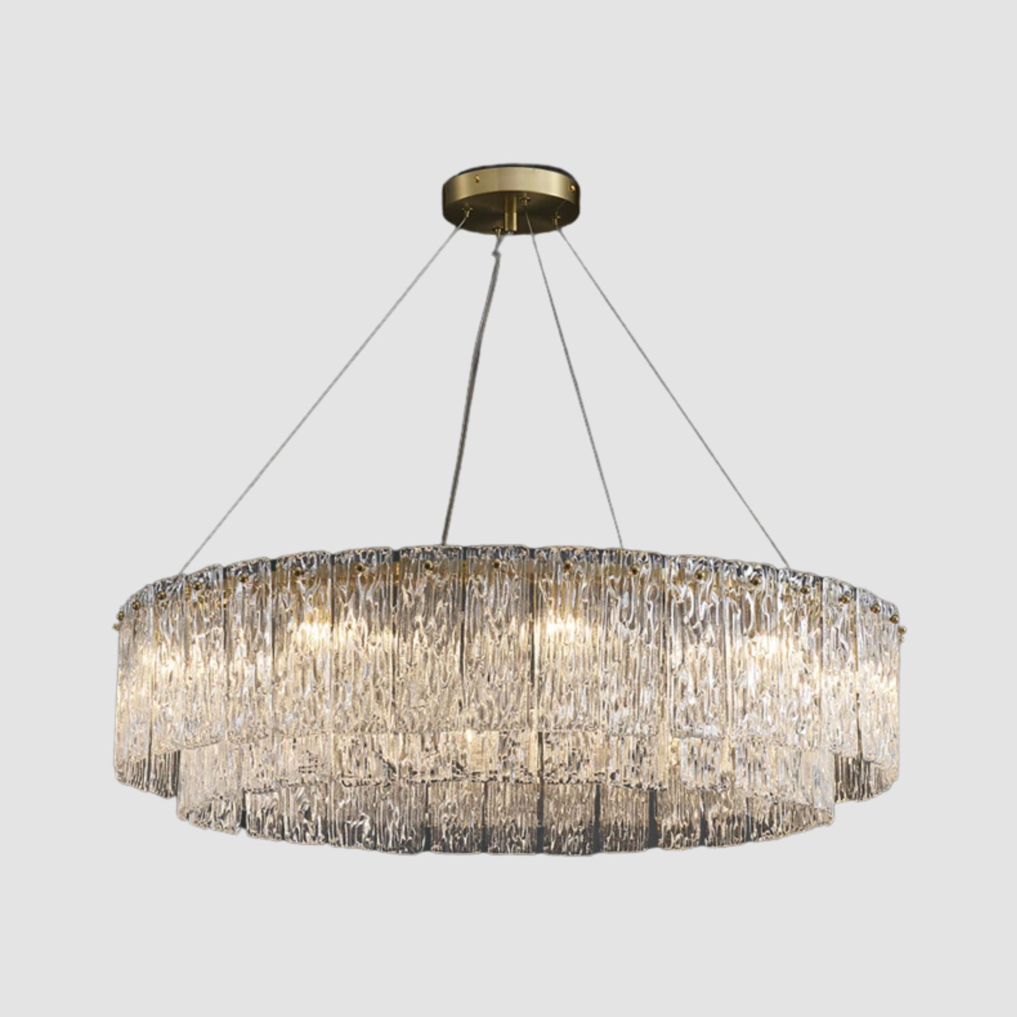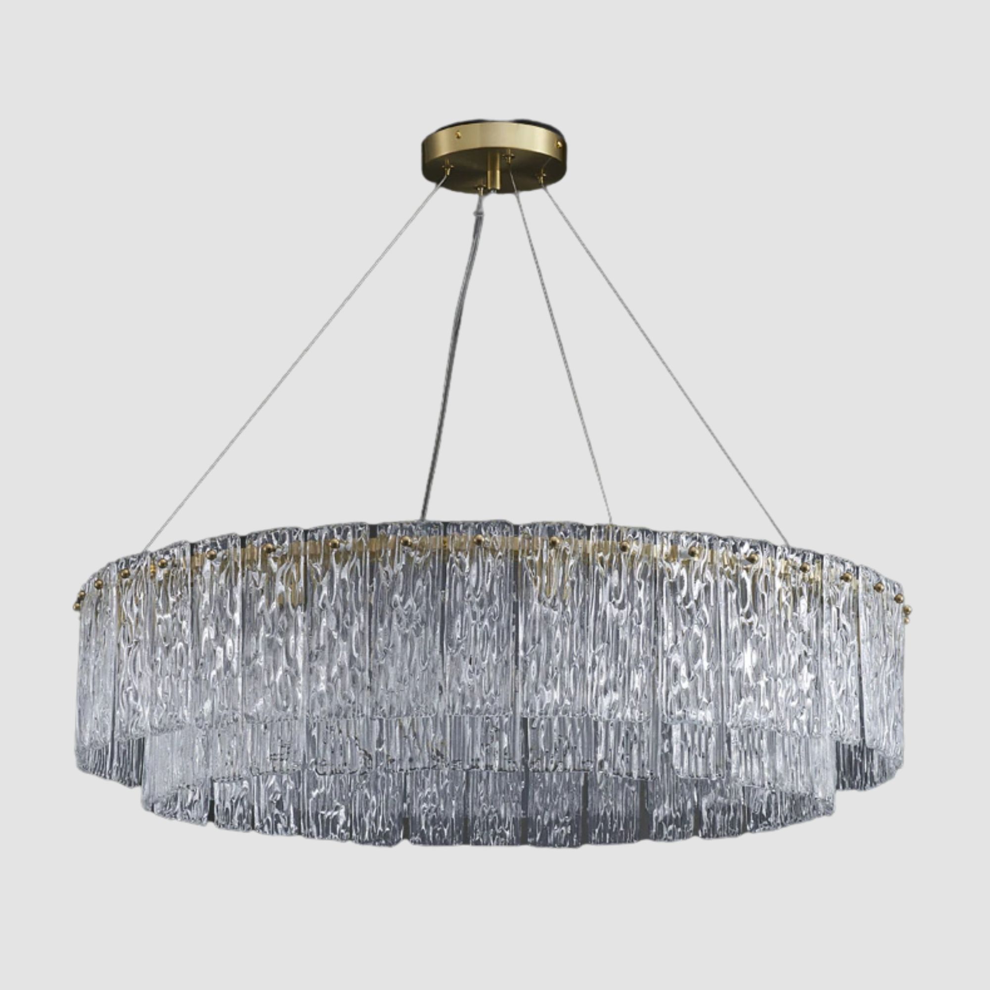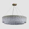 تتميز هذه الثريا الأنيقة بتصميم دائري فخم تحتوي علي شرائح زجاجية منقوشة مع إطار باللون الذهبي